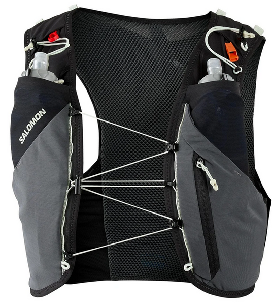 Designed to fit Salomon soft flasks, these front pockets limit bouncing. Top elastic loops secure your flasks and keep them ready to drink.